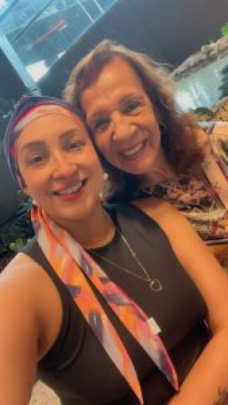 Kleris com a mãeO acolhimento e os relatos de casos até mais avançados que foram curados, deram a força que ela precisava naquele momento. Com o início do tratamento, um novo choque: a perda dos cabelos já na primeira sessão de quimioterapia. “Foi muito difícil pra mim, e confesso que ainda é. Tem muito a ver com a sua identidade, e aqui faz muito calor, usar lenço, boné ou peruca, tudo isso esquenta muito e eu me sinto incomodada. Acaba sendo muito desconfortável. Eu aceitei o tratamento, entendi que muitas mulheres passam por isso e que a gente tem essa oportunidade de estar curada. Eu me pego nesse pensamento de cura”.
