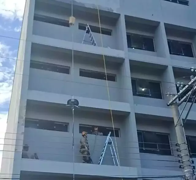 No momento em que as equipes chegaram, o homem estava no parapeito do 2º andar do prédio. Ele estava consciente e com uma lesão na perna, além de escoriações.