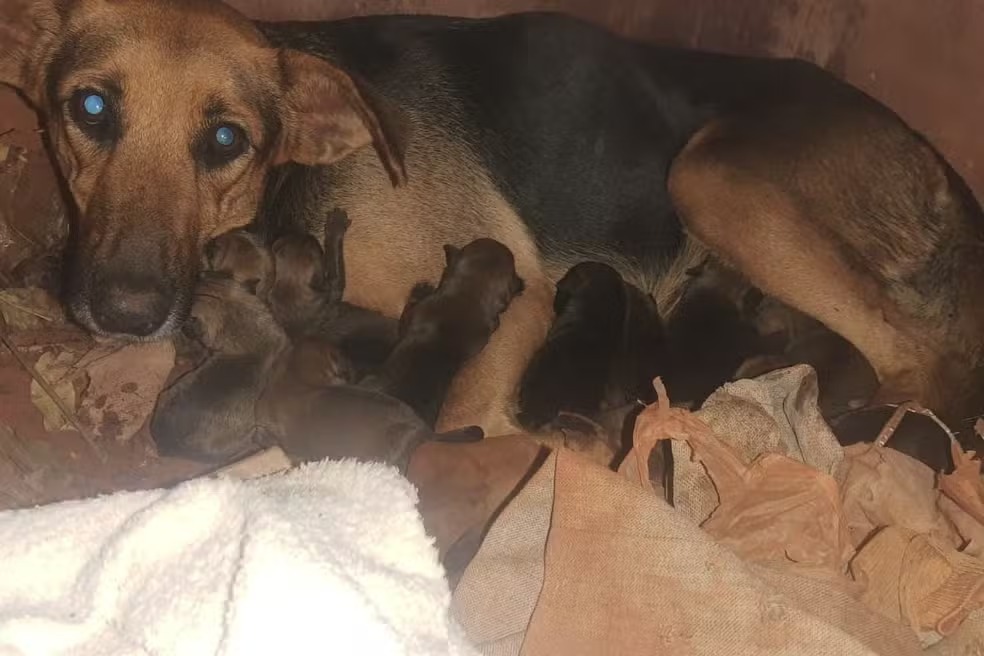 O Corpo de Bombeiros foi mobilizado por voluntárias de uma organização ligada à causa animal para fazer a retirada dos bebês. Ao todo, 13 filhotinhos nasceram no local macabro e improvisado, enquanto o 14º nasceu já quando a cadela estava no carro de resgate.