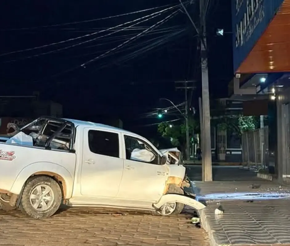 Uma caminhonete ficou com a parte frontal completamente destruída após se envolver em um acidente na madrugada deste domingo (7), na Rua Marechal Mallet, região central de Aquidauana.