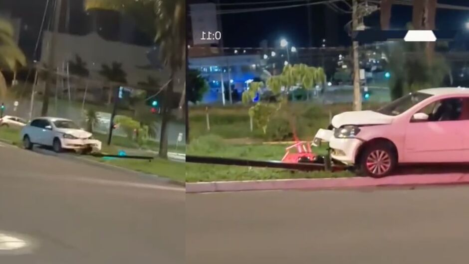 Um Volkswagen Voyage derrubou um semáforo após invadir o canteiro central da Avenida Afonso Pena, na noite desta quarta-feira (19), no cruzamento com a Rua Dr. Antônio Alves Arantes, próximo ao Shopping Campo Grande, no bairro Chácara Cachoeira.