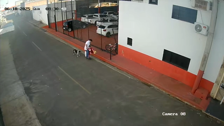 O ato de violência acontecem em via pública, na terça-feira (17). Segundo a investigação, o autor estava acompanhado da vítima, que seguia sozinha na calçada ao seu lado. O jovem é visto segurando uma sacola grande e falando ao celular.