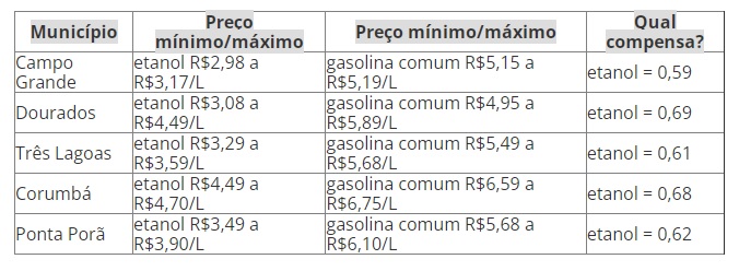 Confira o preço médio do etanol em comparação ao da gasolina em cinco cidades de Mato Grosso do Sul, conforme dados da ANP: