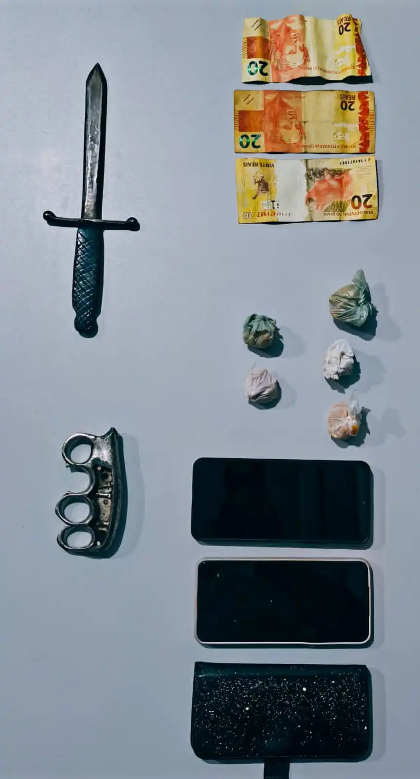 Segundo a ocorrência, os policiais abordaram os suspeitos e, durante a revista, encontrou 55 gramas de crack, R$ 60 em cédulas, três aparelhos celulares, um punhal e um soco inglês.