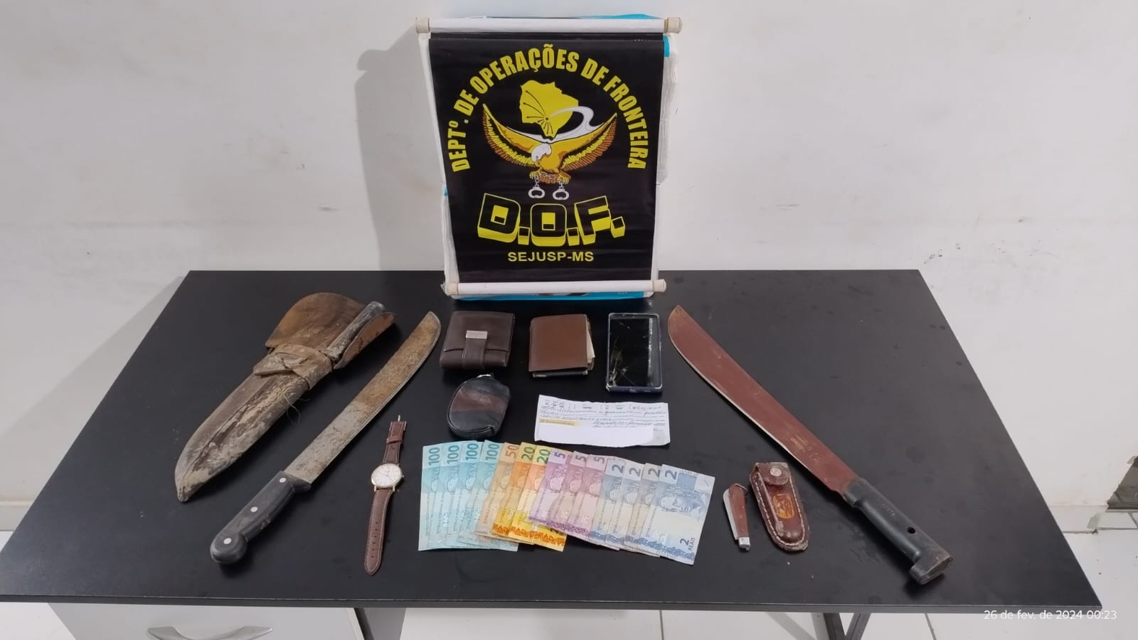 Com eles foram achados dois facões e vários objetos da vítima, entre eles a carteira com os seus documentos, relógio e uma quantia de R$ 225. No interior da S-10 foi achado um cheque do Banco do Brasil no valor de R$ 844 no nome da vítima, um aparelho celular Samsung de cor branca com a tela e câmeras danificadas e uma bolsa marrom com R$ 288.