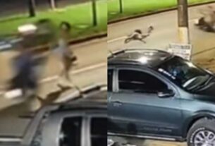 Os policiais foram ao local, e ao chegarem encontraram o homem de 32 anos, no portão do imóvel tentando agredir a mulher. Pelo que consta, o rapaz estava agressivo e alcoolizado, tentou reagir a abordagem, mas foi imobilizado, algemado e colocado dentro da viatura.